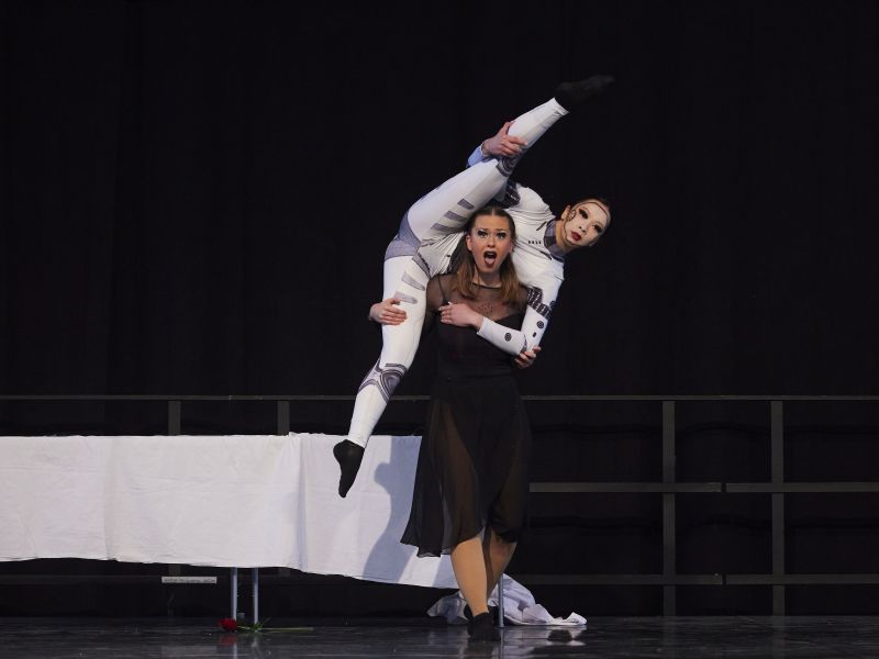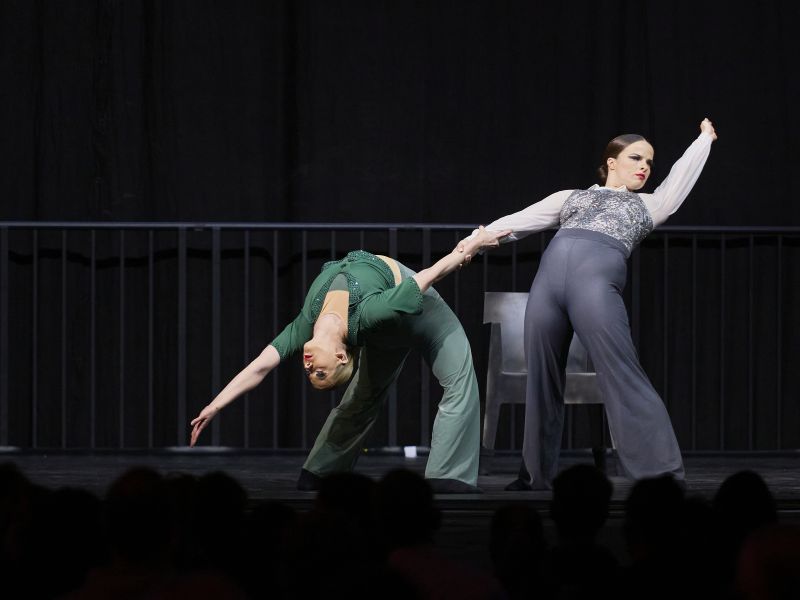 Zwei TänzerInnen erzählen gemeinsam eine Geschichte, die Ausdruck, Synchronität und Interaktion verbindet.