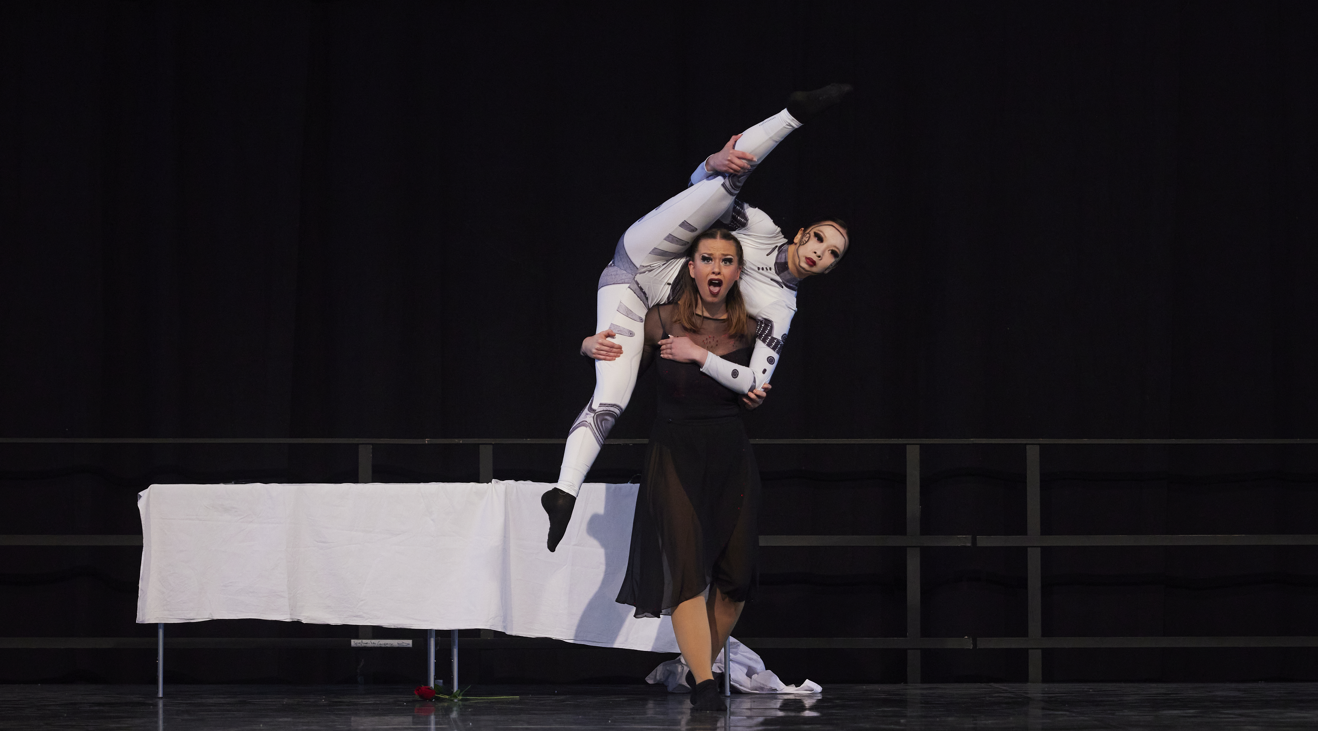 Zwei TänzerInnen erzählen gemeinsam eine Geschichte, die Ausdruck, Synchronität und Interaktion verbindet.